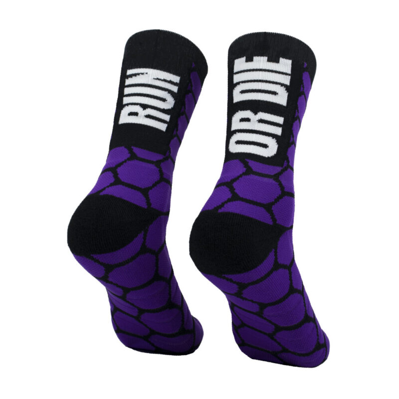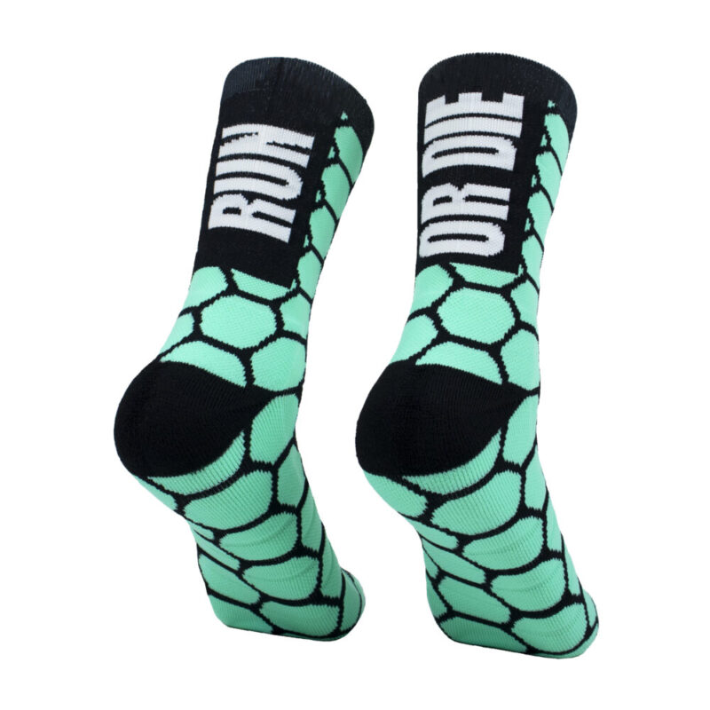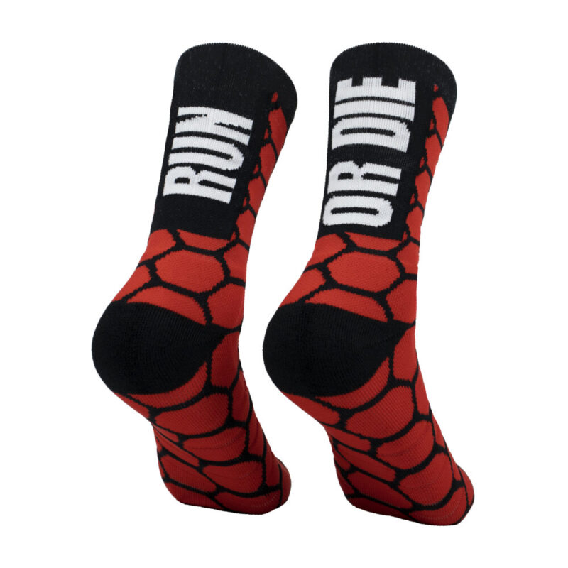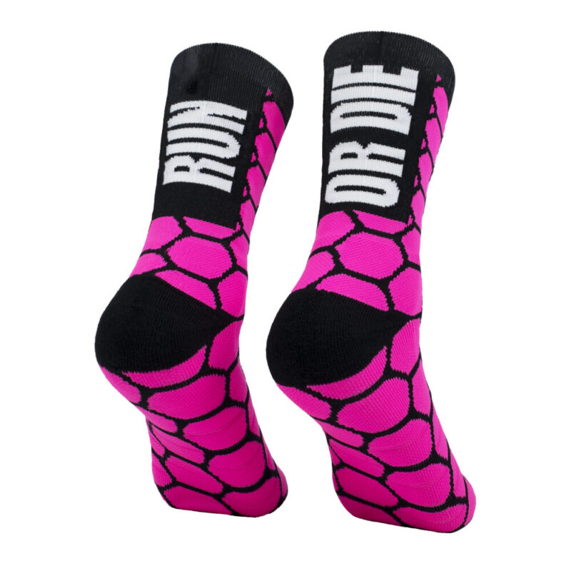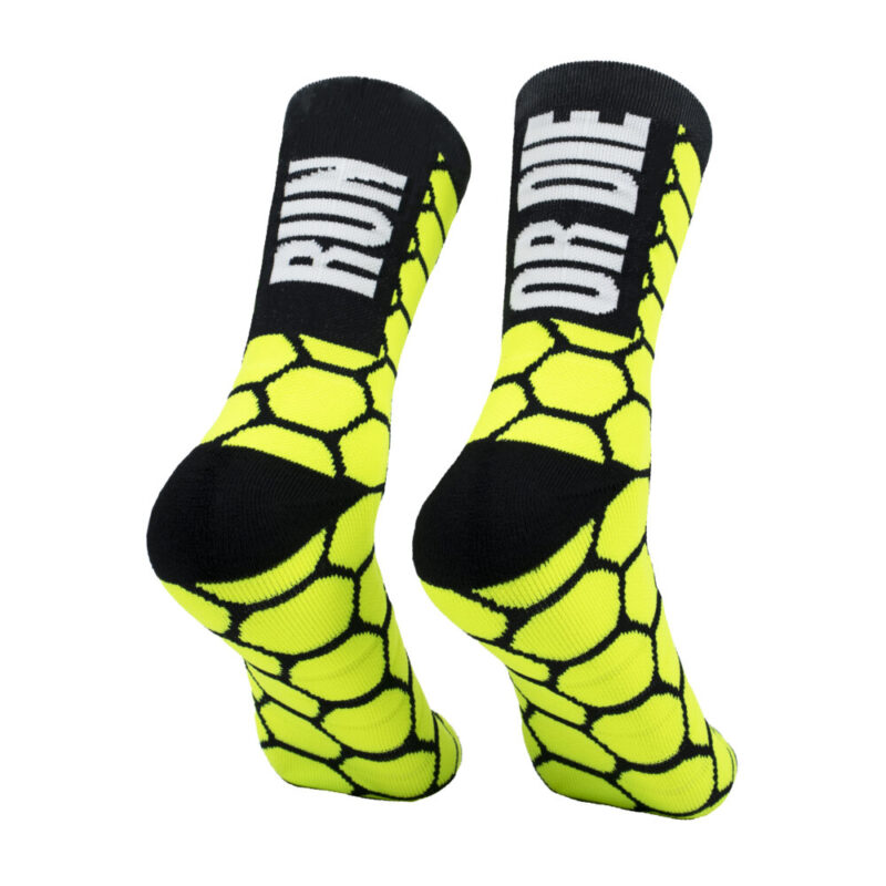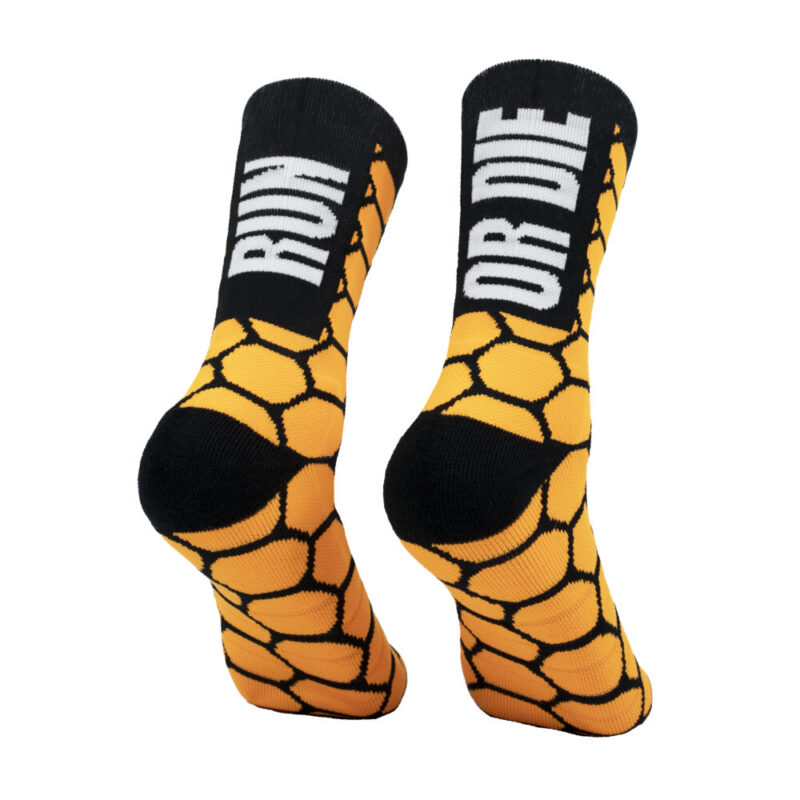 Calcetines de trailrunning compresivos de alta calidad. Nuestros calcetines de compresión ofrecen máxima durabilidad y confort en la pisada debido al rizo de refuerzo en puntera, prepuntera y talón. Calcetines con formas geométricas de panal de abeja RUN OR DIE. Bonitos, originales y llamativos para vestir con un look urban de edición limitada.
